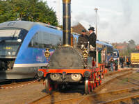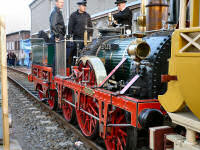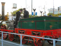 1835 gebaut, war der „Adler“ zwar nicht die allererste Lok in Deutschland, jedoch die erste kommerziell erfolgreiche Lokomotive im regelmäßigen Personen- und Güterverkehr. Das Original verkehrte ab 1835 zwischen Nürnberg und Fürth, der hier gezeigte voll funktionsfähige Nachbau als Shuttle zwischen dem Bhf. Lichtenberg und der alten Lokeinsatzstelle mit Fahrzeugaustellung; Präsentation auf der Drehscheibe inklusive.
