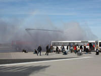 Vor Ort waren neben den beiden Bussen, welche den verunglückten A320 darstellten, bereits zahlreiche Pressevertreter und andere Beobachter versammelt. Eine Hebebühne erlaubte den Fotografen Aufnahmen von oben. Nach letzten Einweisungen stiegen wir in das „Flugzeug“ um, also in die beiden Busse. Nach kurzer Zeit fiel auf, daß wir eigentlich alle verkehrt herum saßen und quasi rückwärts flogen – die rechte „Tragfläche“ und somit die Pyrotechnik befand sich links von uns. Die Busse standen aber nun mal so und für den Verlauf der Übung war das auch nicht weiter von Bedeutung.