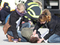 Parallel lief das Schminken der Verletzten weiter. Insbesondere die krassen Fälle wie blasses Leichengesicht, offene Bauchverletzung, Verletzung der Halsschlagader oder dicke Glassscherbe im Arm sorgten für großes Erstaunen und Begeisterung sowie den ein oder anderen makaberen Kommentar („Damit solltest Du mal zum Arzt!“) Doch auch zahlreiche blutige Glassplitter im Gesicht, Hautfetzen oder offene Knochenbrüche sahen erschreckend echt aus – ein großes Kompliment an das RUD-Schminkteam.