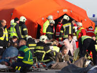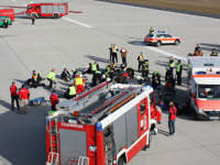 In der Nähe waren zur Unterstützung inzwischen drei Rettungshubschrauber gelandet (aber nur „Deko“, auch wenn die Besatzungen in die Rettungsaktion eingriffen). Zudem war unmittelbar am Unfallort ein großes Zelt aufgebaut worden, in welches die Verletzten auf Tragen gebracht wurden. Ob es auch tatsächliche Transporte in umliegende Krankenhäuser gab, entzieht sich meiner Kenntnis. Geplant waren eine Handvoll echter Rettungsfahrten, alle anderen Verletzten sollten mit RTWs lediglich zu einer der Zufahrten zum Flughafengelände transportiert und von dort mit einem Bus wieder zurückgebracht werden.