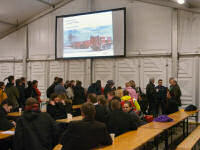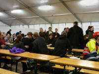 Vom Bahnhof Schönefeld aus wurden wir nach Abgleich mit der Namensliste mit zwei Bussen raus zum BER gefahren und in ein großes, beheiztes Zelt geführt. Draußen war noch Zeit für ein paar Schnappschüsse vom hell erleuchteten Terminal, drinnen konnten wir uns dann erstmal mit Kaffee und Tee versorgen.