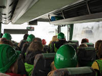 Bereits im Bus erhielten wir unseren Komparsen-Ausweis für den Tag, einen Schutzhelm, eine Warnweste mit dem Aufdruck „Flughafen-Tester“ sowie eine Literflasche Mineralwasser. Auf meinem sowie einigen benachbarten Plätzen lag diese Ausrüstung allerdings noch nicht bereit, so daß wir inmitten der anderen Teilnehmer erstmal etwas ratlos und „nackt“ dasaßen. Eine unserer Betreuerinnen vom ORAT-Team (Operational Readiness and Airport Transfer) besorgte aber schließlich das Nötige aus dem hinteren Teil des Busses.