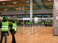 War diese Hürde genommen, folgte der Sicherheitscheck. Alle mitgeführten Dinge – Handgepäck, Jacken, Gürteltaschen etc. – wurden in große Plastikschalen gelegt, welche dann auf einem Rollenband durch den Scanner gefahren wurden. Zwar war die Situation aufgrund des Andranges manchmal etwas unübersichtlich, aber die Leute in diesem Bereich waren doch ziemlich locker und bisweilen auch einer flapsigen Bemerkung nicht abgeneigt. Bedingt durch die Übungssituation wurden z.T. auch Dinge durchgewunken, die aufgrund des allgemeinen Sicherheitswahns im realen Betrieb strikt untersagt wären, z.B. 0,5l-Getränkeflaschen. Ein in der Reihe vor mir stehender Reisender hatte mich allerdings trotzdem vorbeigewunken, weil er sein Bierchen vorsichtshalber doch lieber erst noch austrinken wollte …