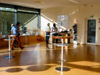 Nach einem kurzen Abstecher aufs Freigelände und zum Spreeufer mit aus Abwärme beheizten Bänken gingen wir zurück ins Besucherzentrum, wo bei einem leckeren kalten Buffet noch genügend Zeit zum Diskutieren und Fragen stellen war. Allerdings redete meist nur einer und alle lauschten: Kraftwerksleiter Funke plauderte entspannt aus dem Nähkästchen und wußte so manch unterhaltsame Anekdote aus dem Kraftwerksalltag zu berichten: